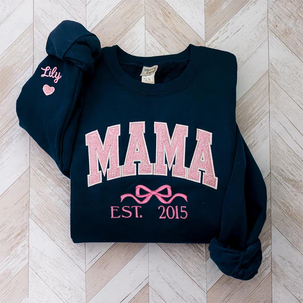 Honor the beauty of motherhood with our Personalized Mom Glitter Embroidered Sweatshirt! Featuring shimmering glitter embroidery, a delicate bow accent, and the special “Est. Year” detail, this sweatshirt is both stylish and sentimental.